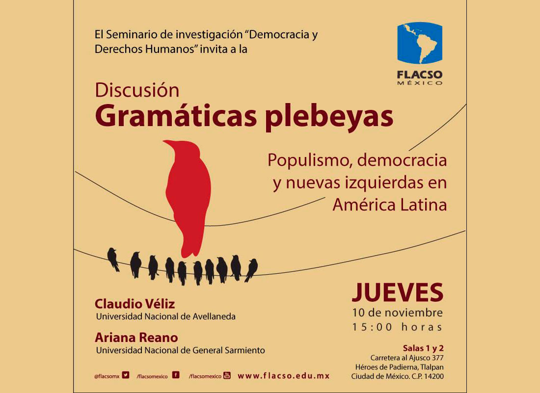 En el marco de las convocatorias de Redes Universitarias entre instituciones argentinas y del exterior, y más precisamente, del último de los proyectos compartidos (“Red para el análisis de los procesos de democratización y emancipación en América Latina” llevada adelante en la Universidad Nacional de Avellaneda a través del Área de Cooperación Internacional), se presentó, en la sede mexicana de la FLACSO, el libro: Gramáticas plebeyas. Populismo, democracia y nuevas izquierdas en América Latina.