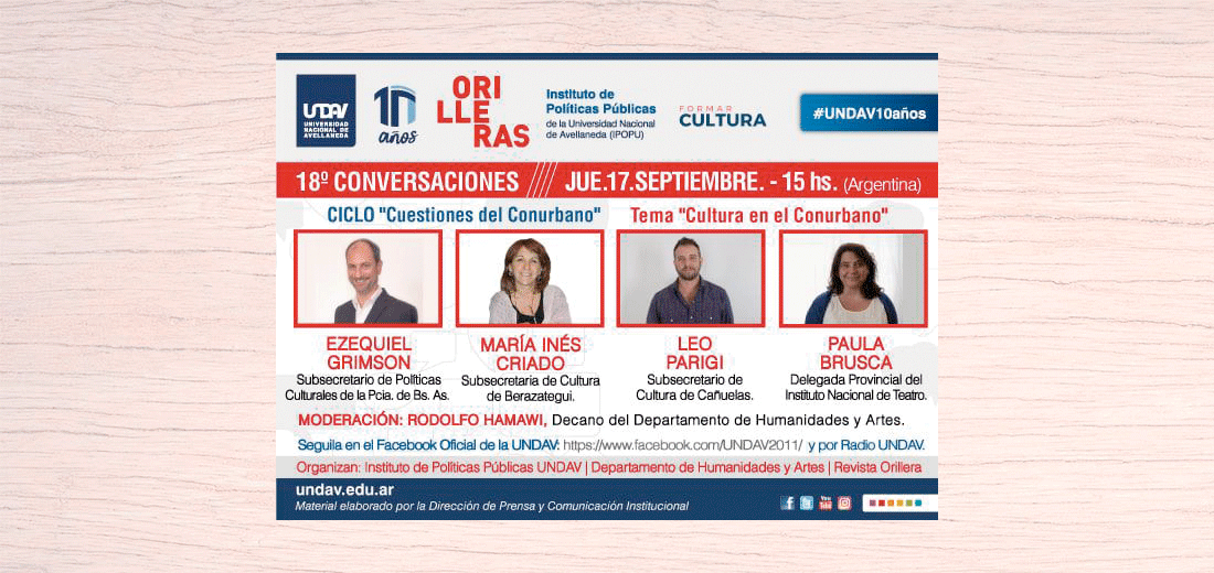 La Universidad Nacional de Avellaneda (UNDAV), a través de su Departamento de Humanidades y Artes; y el Instituto de Políticas Públicas, invita a participar de un nuevo encuentro de “Cuestiones del Conurbano” del ciclo de charlas Conversaciones Orilleras. La actividad se llevará a cabo el jueves 10 de septiembre, a las 15 horas, a través de la página oficial de Facebook de la UNDAV. También vas a poder escucharla en Radio UNDAV.