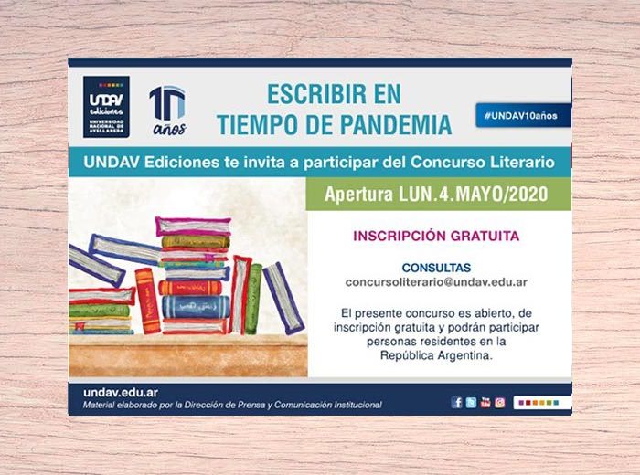 Escribir en tiempo de pandemia: ¡Ya se puede descargar el libro en formato digital! UNDAVEdiciones / 30 marzo, 2021 Misceláneas Noticias Está accesible, de manera gratuita, en la web de UNDAV Ediciones. El material compila los siete mejores trabajos presentados en el concurso literario 2020. Leer más…panen77panen77panen77 Tags: #EscribirEnTiempoDePandemia Comparte este posteo Related posts 27 noviembre, 2020 Escribir en Tiempo de Pandemia: el Jurado del concurso literario emitió su dictamen 7 julio, 2020 El Concurso Literario Escribir en Tiempo de Pandemia prorroga su inscripción hasta el 24 de julio 24 junio, 2020 El Concurso Literario Escribir en Tiempo de Pandemia superó las 100 obras