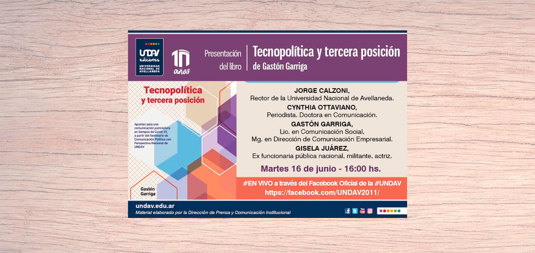El miércoles 15 de junio se presentó el libro Tecnología y tercera posición. Apuntes para una comunicación justicialista en tiempos de Covid-19, a partir del Seminario de Comunicación Política con Perspectiva Nacional de Universidad Nacional de Avellaneda.